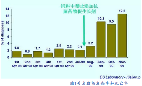 歐盟對(duì)獸用抗菌藥在養(yǎng)殖業(yè)上的使用要求比較嚴(yán)格。瑞典是最早在飼料中禁止添加抗菌藥物促生長(zhǎng)劑的國(guó)家,從1999年7月1日起歐盟禁止桿菌肽鋅、螺旋霉素、維吉尼亞霉素和泰樂(lè)菌素4種抗生素在畜禽飼料中作為生長(zhǎng)促進(jìn)劑使用,2006年1月1日起歐盟又禁止所有的抗菌藥物促生長(zhǎng)添加劑在養(yǎng)殖業(yè)上使用。然而禁止使用抗菌促生長(zhǎng)劑對(duì)動(dòng)物健康和動(dòng)物福利產(chǎn)生了很大的負(fù)面影響,丹麥DANMP的報(bào)道(2000年)指出禁用后丹麥豬場(chǎng)的發(fā)病率和死亡率增加了600%,如圖1所示。禁用后導(dǎo)致整個(gè)歐盟家禽的壞死性腸炎呈流行狀態(tài),飼料報(bào)酬下降,上市體重和整齊度降低,大大提高了生產(chǎn)成本。