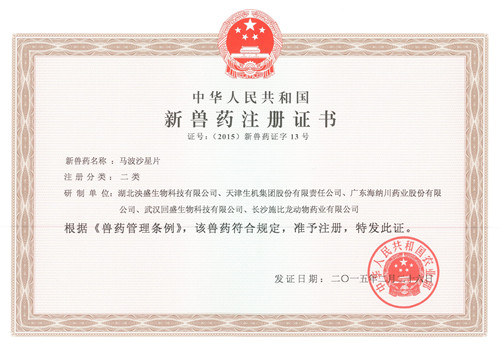 新獸藥注冊(cè)證書(馬波沙星片)